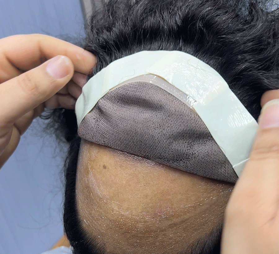 Tape application is a non-surgical hair replacement technique where a high-grade, skin-safe adhesive tape is used to attach a hair system to your scalp.